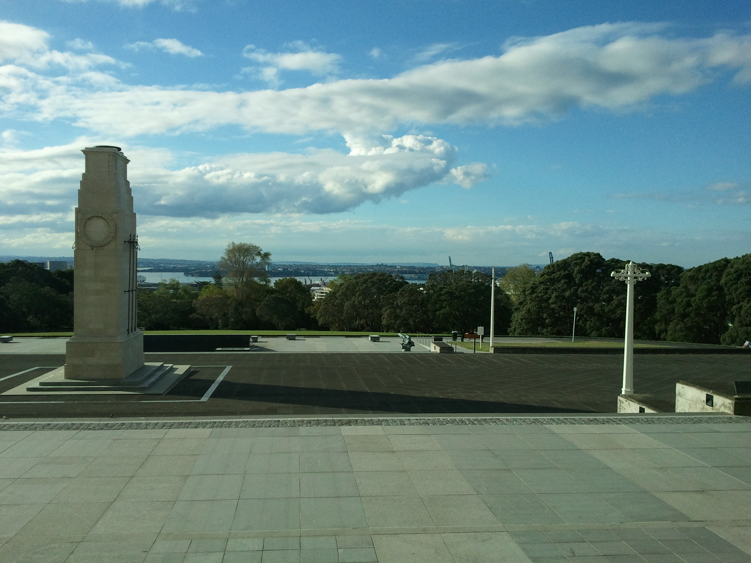The forecourt of the Auckland (War Memorial) Museum, its New Zealand/natural/war history museum. The museum is behind the shot: this looks north toward downtown and Freemans Bay.