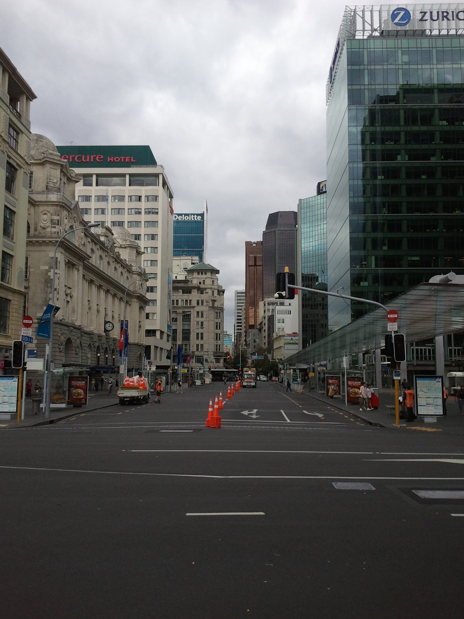 This is downtown Auckland, from the waterfront. A triathlon was just finishing up when I got there; the cones marked the bike path.